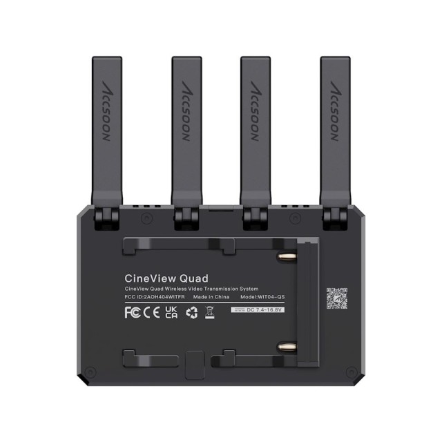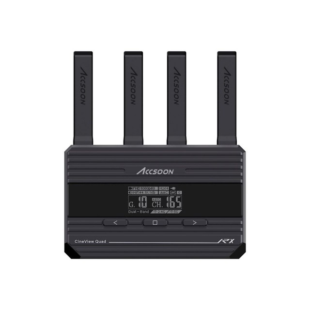 Accsoon CineView Quad je dvojpásmový (2,4 GHz a 5 GHz) bezdrôtový kamerový video vysielač a prijímač SDI&HDMI s jedinečnou skladacou anténou. Vysiela a prijíma HD video a HQ zvuk prostredníctvom jedinečnej patentovanej dvojpásmovej prenosovej technológie spoločnosti Accsoon. Vďaka technológii dvojpásmového prenosu dokáže CineView Quad prenášať dáta na vzdialenosť 150 m (500 stôp) s takmer nulovým oneskorením.