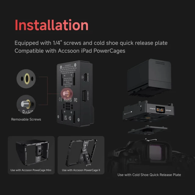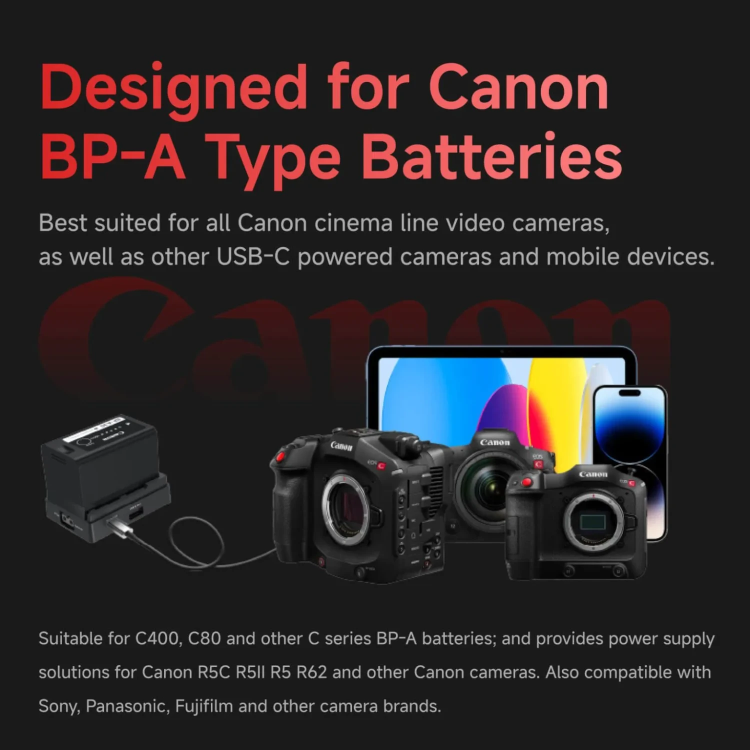 Okrem systémov Canon je táto batériová doska BP-A kompatibilná aj so značkami Sony, Panasonic, Fujifilm a ďalšími značkami kamier vďaka viacerým výstupným možnostiam. Je navrhnutá tak, aby poskytovala ekvivalentný výstupný napätie ako batéria V-mount, a poskytuje robustné napájanie pre kamery a príslušenstvo v kompaktnom a ľahkom vyhotovení.