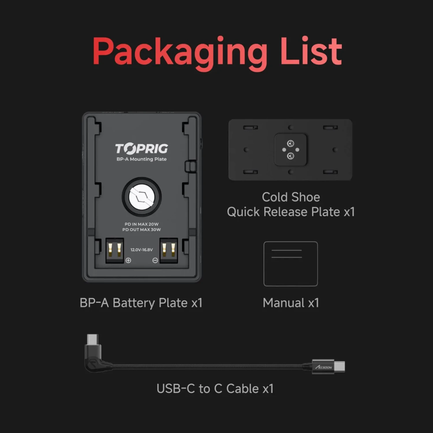 Batériová doska Accsoon ACC-BC-08 TopRig BP-A je kompaktné a univerzálne napájacie riešenie určené pre batérie Canon BP-A, ktoré poskytuje kombinovaný výstup až 60 W na napájanie filmových kamier, bezzrkadlových fotoaparátov a mobilných zariadení.