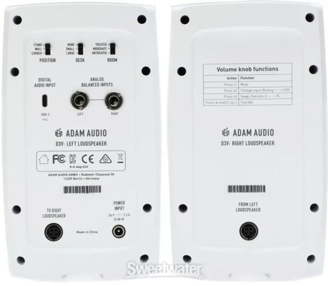 D3V je vybavený vstupom USB-C a dvoma vyváženými zásuvkami TRS, takže ponúka vysokokvalitné digitálne a analógové pripojenie. Zjednodušené ovládacie prvky zahŕňajú multifunkčný gombík hlasitosti, intuitívne prepínače kompenzácie miestnosti a viacfarebný indikátor stavu. D3V sa dodáva s odnímateľnými stojanmi pre monitory, ako aj so zabudovanými závitovými bodmi pre montáž mikrofónových stojanov (3/8″) na dokonalé umiestnenie v akomkoľvek prostredí.