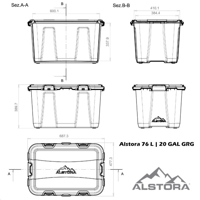 Nádoby Alstora sú stohovateľné a priestorovo úsporné: keď sú prázdne, vkladajú sa jedna do druhej; keď sú plné, možno ich stohovať, aby sa dosiahlo usporiadané a funkčné skladovanie. Integrované otvory vo veku aj v základni sú určené na upevnenie popruhov, visacích zámkov a/alebo plomb.