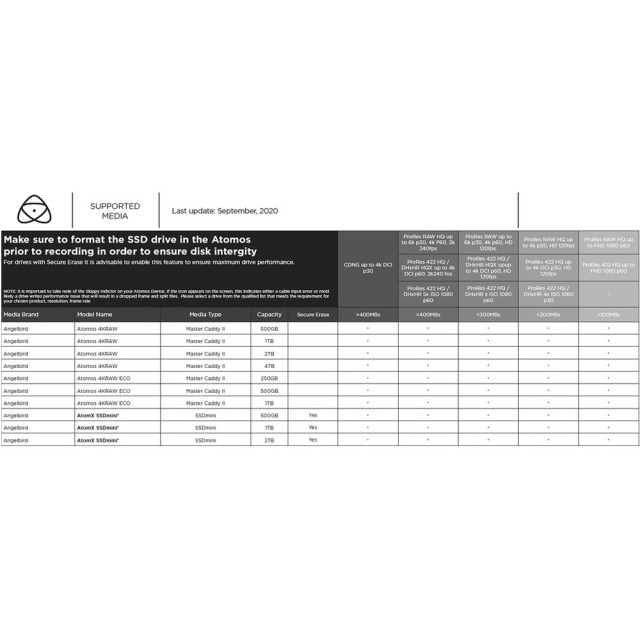Disk AtomX SSDmini od spoločnosti Angelbird bol vyrobený na mieru pre nový monitorový rekordér Atomos Ninja a je dokonale kompatibilný so všetkými ostatnými dostupnými rekordérmi. Disk AtomX SSDmini je o 20 % menší ako priemerný disk SSD (aby sa zmestil do malých rozmerov zariadenia Ninja), ponúka 1 TB úložného priestoru, má trvalú rýchlosť čítania 540 MB/s a rýchlosť zápisu 500 MB/s, zachytáva CDNG až do 4K 30p, ProRes RAW HQ 5,7K až do 30p, plus 4K 60p a 2K 240p, má konektor SATA III a podporuje technológiu Stable Stream™, vďaka ktorej nikdy nevynecháte žiadnu snímku.