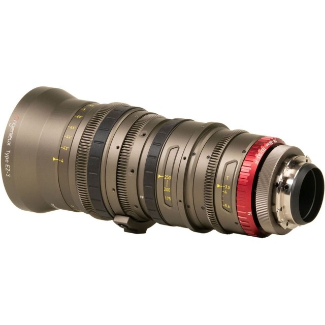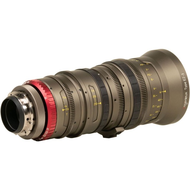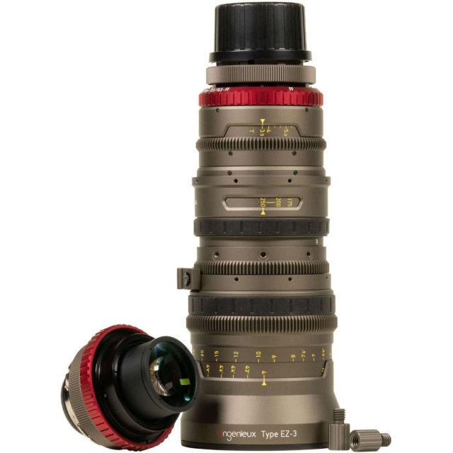 EZ-3 je nový teleobjektív z radu profesionálnej filmovej optiky Angenieux EZ! Rovnako ako modely EZ-1 a EZ-2 ponúka kompaktné rozmery, vynikajúcu kresbu, dvojité zaostrovacie značky a predovšetkým technológiu "IRO" (Interchangeable Rear Optics), ktorá umožňuje vymeniť zadnú časť optickej sústavy a prestavať objektív na fotoaparáty S35 alebo FF/VV. Vďaka inovatívnej konštrukcii zadného člena je samotná výmena veľmi jednoduchá a trvá približne 5 minút. Balenie EZ-3 Pack obsahuje oba (S35 aj FF/VV) zadné členy pre optické parametre 45-165 mm T/2,3-3 (S35), resp. 68-250 mm T/3,5-4,5 (FF/VV)! Objektív sa štandardne dodáva s (vymeniteľným) bajonetom PL, k dispozícii sú aj voliteľné vymeniteľné bajonety EF, RF a E.