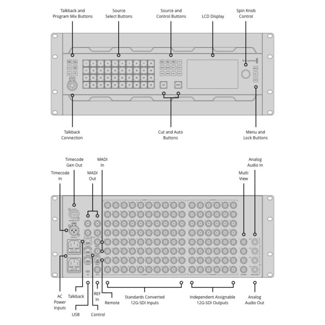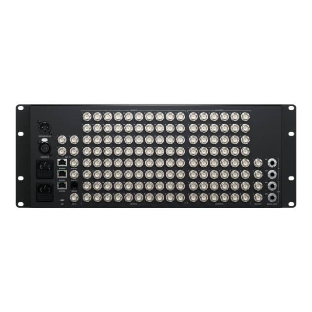 Každý vstup zariadenia je vybavený samostatným konvertorom, ktorý umožňuje konvertovať akýkoľvek video vstup SDI na výstupný štandard prepínača. Každý vstup SDI prepínača môže byť v inom televíznom štandarde - a všetky budú fungovať bez problémov. Zvuk môžete dokonca vyviesť na viacero digitálnych výstupov MADI, čo vám umožní odovzdať zdroje zvuku z prepínača externému zvukárovi na samostatné mixovanie.