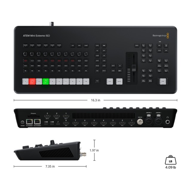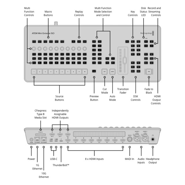 ATEM Mini Extreme ISO G2 je ideálny prepínač na vytvorenie vysokokvalitného vysielacieho štúdia s 8 vstupmi HDMI, vstavaným streamovacím mechanizmom, multiview, rozhraním Thunderbolt na nahrávanie a prehrávanie, webovou kamerou USB, DVE, chroma klávesmi, prehrávačom médií a nahrávaním ISO všetkých 8 video vstupov. Má 3 nezávislé video výstupy, ktoré možno smerovať.