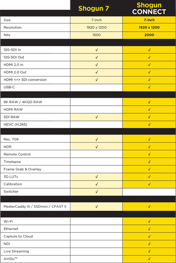 Vďaka super jasnej 7-palcovej obrazovke s rozlíšením 2000nit a viacerým možnostiam záznamu poskytuje Shogun CONNECT prémiový zážitok pri monitorovaní HDR a nahrávaní RAW. Okrem toho obsahuje funkciu priebežnej slučky a krížovej konverzie prostredníctvom rozhrania 12G SDI-IN a OUT. Shogun CONNECT podporuje vstupy SDI RAW až do 6K pri 30 snímkach za sekundu. Dokáže súčasne vysielať štandardné video YCC v slučke cez SDI a HDMI do viacerých zariadení nekompatibilných s RAW.