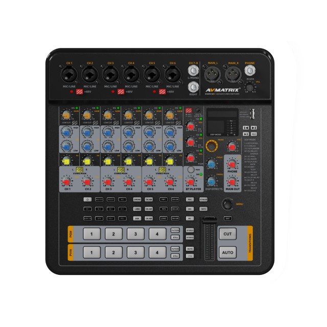 AvMatrix Shark S4M je univerzálny prenosný audio-video prepínač so 6 mikrofónovými a 2 stereo vstupmi, vyváženými výstupmi XLR a pokročilými efektmi DSP. S výstupmi HDMI, pripojením USB-C, podporou streamovania a integrovaným nahrávaním je ideálnym riešením pre živú produkciu a vysielanie.