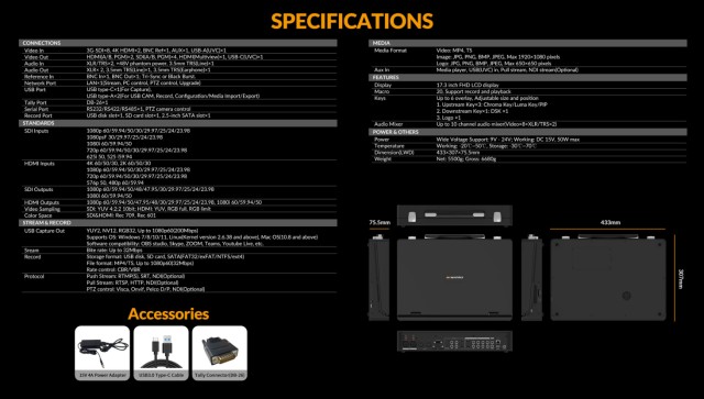AvMatrix Shark S8X Plus-NDI je vysoko výkonný 8-kanálový video prepínač určený na profesionálne živé vysielanie a produkciu videa. Je vybavený 17,3-palcovým displejom FHD IPS, podporuje šesť vstupov 3G-SDI a dva vstupy SDI/4K HDMI, ako aj flexibilné smerovanie viacerých zdrojov. Vďaka robustnej podpore streamovania RTMP(S), SRT, RTSP a NDI ponúka tento prepínač bezproblémové živé vysielanie. Obsahuje pokročilé funkcie videa, ako sú chroma kľúč, luma kľúč, tri prekryvy PIP, POP, DSK a prekrytie loga, spolu s plynulými prechodmi pomocou funkcií T-bar, auto alebo cut. Nahrávanie a prehrávanie je podporované prostredníctvom úložiska USB, karty SD alebo SATA. Zariadenie poskytuje aj profesionálny zvukový vstup XLR so 48V fantómovým napájaním, vstavaný video zvuk a všestranné možnosti výstupu. Medzi ďalšie funkcie patrí 8-kanálový systém ovládania PTZ, podpora makroskriptov a port GPIO pre tally, čo z neho robí špičkovú voľbu pre živé podujatia, štúdiá a vysielacie aplikácie.