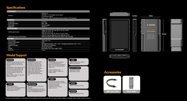 AVMatrix Vlog Selfie Monitor. 3×porty typu C; USB-C OUT podporuje funkciu OTG pre pripojenie USB príslušenstva, ako sú doplnkové svetlá, a poskytuje výstupný výkon. Kompatibilný s väčšinou vlajkových smartfónov s plne funkčnými portmi typu C; podporuje vstup HDMI 1080p. 3,97-palcová obrazovka s interakciou dvoch obrazoviek v reálnom čase.