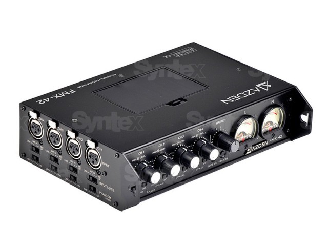 Prenosný audiomix Azden FMX-42 obsahuje štyri XRL linkové/mikrofónne vstupy s individuánym nastavením úrovne a panorámy, zapínateľné 48V phantom napájanie zvlášť na každý kanál, profesionálne VU metre pre presné nastavenie úrovne, nastavenie master úrovne, generátor 1k tónu, dva symetrické XLR výstupy (prepínateľný medzi linkou a mikrofónnym výstupom), stereo mini-jack výstup, 10-pin konektor pre spatné audio z kamery a výstup na slúchadlá s nastavením úrovne.