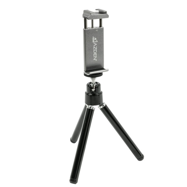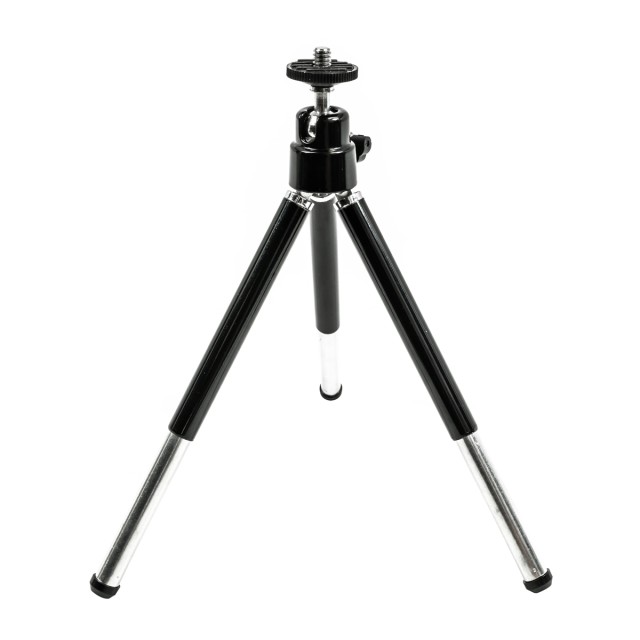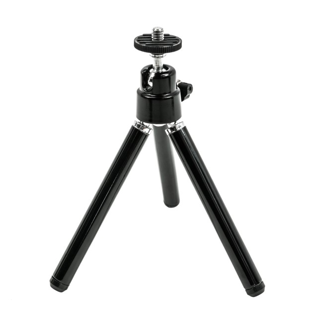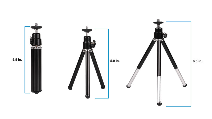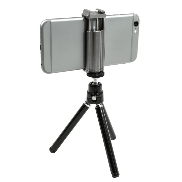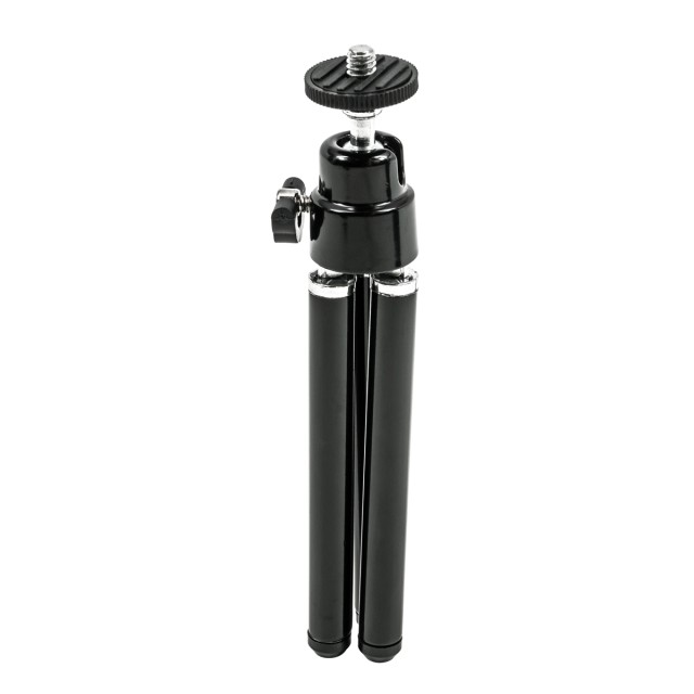 Stojan na statívTento ľahký, miniatúrny statív funguje dobre ako stolový stojan pre váš smartfón alebo sa sklopením nôh premení na rukoväť na natáčanie videa na cestách. Rozšíriteľné nohy umožňujú nastavenie výšky statívu v rozsahu 5,0 - 6,5 palca. Kĺbová hlava s guľovým kĺbom umožňuje nastaviť ideálny sklon a uhol. Naklonenie o 90º na orientáciu na výšku je možné pomocou bočného zárezu, zatiaľ čo hlavu je možné utiahnuť na mieste pomocou skrutky s krídlovým hrotom. Vďaka univerzálnemu montážnemu závitu ¼"-20 je statív použiteľný aj s inými malými fotoaparátmi.