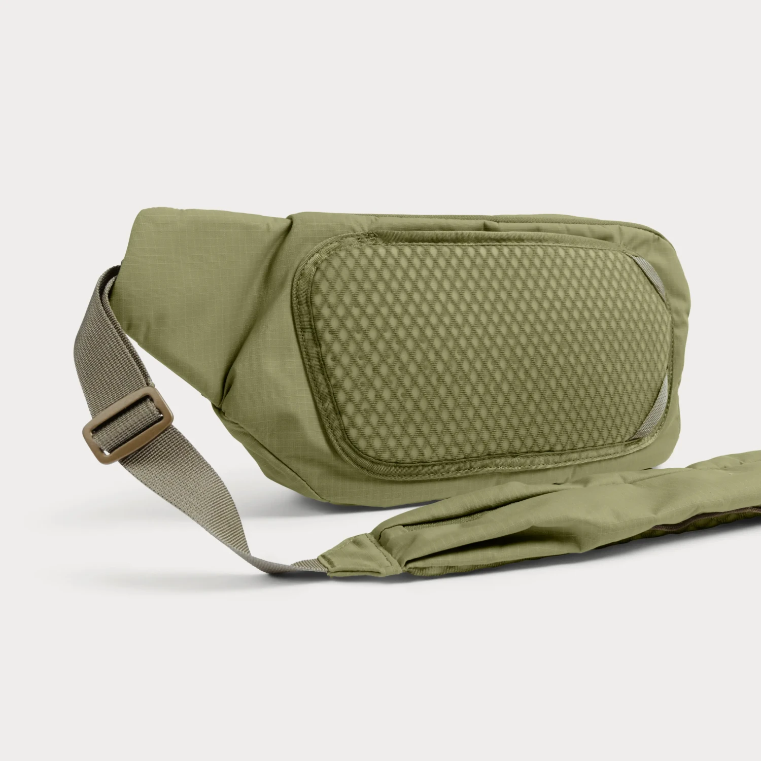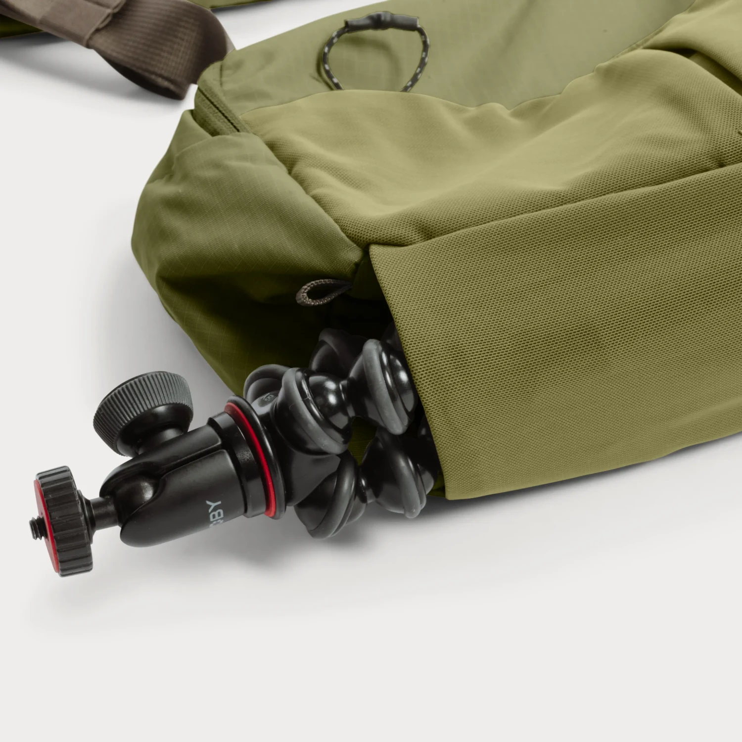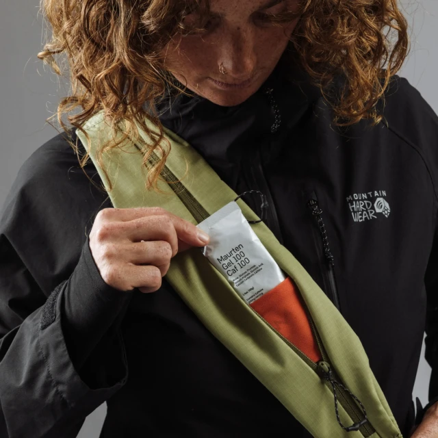 Do popruhu je zabudované vrecko s ľahkou výstelkou a samostatnou sponou, aby ste mali telefón, kľúče, AirPods alebo mobilné objektívy vždy po ruke.