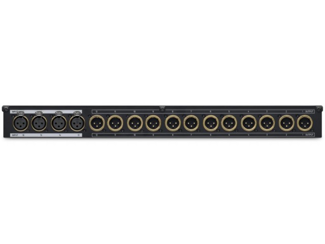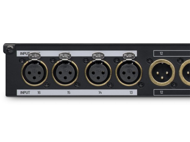 Na zadnom paneli sa logicky nachádzajú protiľahlé konektory označené INPUT/OUTPUT. Prvých dvanásť je XLR samec a možno ich použiť na príjem signálov z predných vstupov. Zvyšné štyri sú XLR samce a prijímajú signál z výstupov pripojených zariadení.