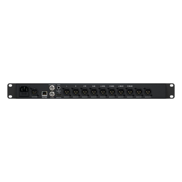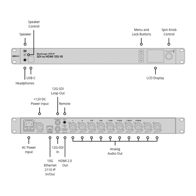 Blackmagic 2110 IP SDI na HDMI 12G-10 obsahuje desať kanálov analógového zvukového výstupu XLR na monitorovanie priestorového zvuku, ktorý umožňuje diaľkové ovládanie hlasitosti a nastaviteľné oneskorenie, ideálne na zosúladenie so zvukom v televízoroch a projektoroch. Obsahuje variabilný zisk a oneskorenie na dokonalú AV synchronizáciu a 3D LUT na presnú kalibráciu farieb HDMI displejov. Zariadenie má predný LCD displej s náhľadom videa, úrovňami zvuku a ponukami, ako aj výstup na reproduktor a slúchadlá.