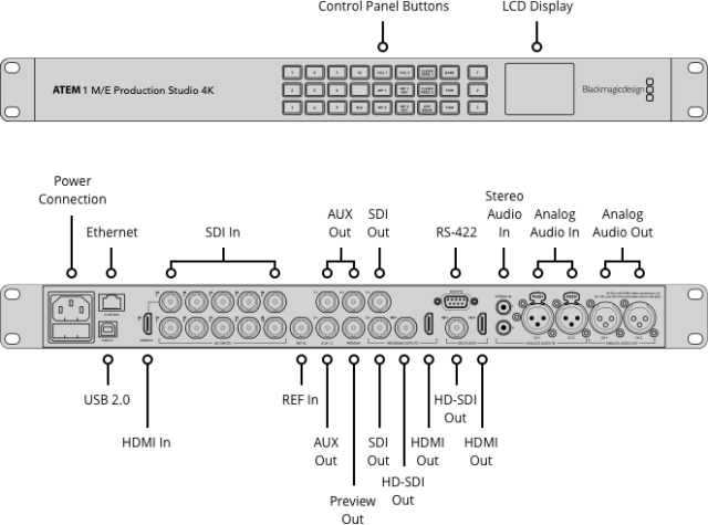 Zařízení ATEM 1 M/E Production Studio 4K disponuje elegantním čelním panelem z hliníkové slitiny. Tamtéž je umístěna i klávesnice dovolující přepínat směrování signálu každého ze tří Aux výstupů, jejich stav lze kontrolovat na zabudovaném LCD displeji. Přepínání Aux výstupů je důležitou funkcí nejen během živé produkce, ale i při nastavování přístroje.