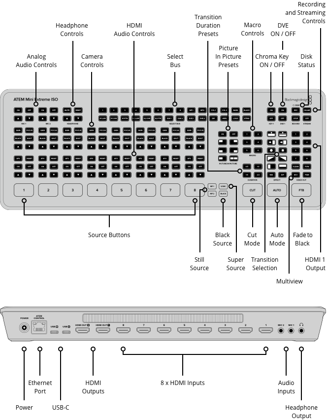Režimy ATEM Mini majú integrovanú kompaktnú konzolu s tlačidlami na výber vstupov a efektov. Modely ATEM Mini Pro a Extreme ponúkajú aj tlačidlá na ovládanie nahrávania a streamovania a prepínanie výstupu medzi výstupmi z kamery a režimami Program a Multiview. Na zadnom paneli sa nachádzajú vstupy HDMI pre kamery alebo iné zdroje videa, vstupy pre mikrofón, rozhranie USB a výstupy HDMI ("Aux").