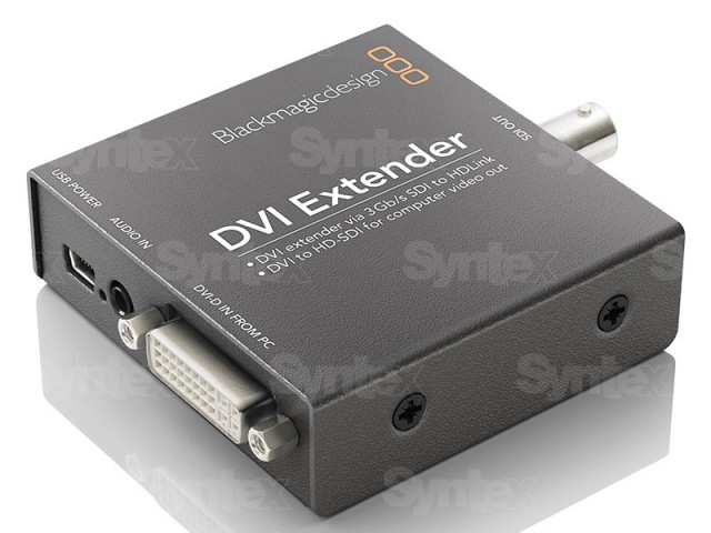 S DVI Extenderom dokážete využiť váš počítač na vytvorenie 3D grafiky a v reálnom čase vysielať v štandardnom alebo vysokom rozlíšení. Stačí len nastaviť na výstupe DVI Extendera NTSC, PAL, 720HD alebo 1080HD rozlíšenie a pripojiť audio pomocou jack konektora. DVI Extender obsahuje 3,5mm audio jack vstup takže môžete pripojiť audio z vašeho počítača. To znamená, že dostanete plne akcelerovanú 3D grafiku a zvuk z počítača do SDI. DVI Extender nepotrebuje špecílne zdroje napájania, pretože ho dokážete napájať s ktoréhokoľvek počítača prostredníctvom USB portu.