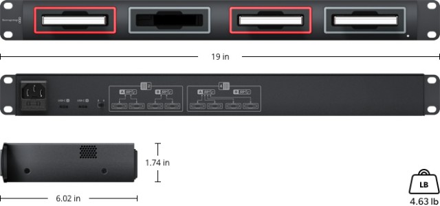 Aktivita disků je na čelní masce indikována diodami, zadní panel hostí dva porty typu USB-C spolu s přepínačem dovolujícím použít všechny čtyři disky s jediným USB-B rozhraním, či sdílet dva páry disků s dvojicí USB-C sběrnic. Blackmagic MultiDock může hostit až čtyři 2,5“ SSD disky na platformách macOS X a Windows. Uživatelé tak mohou snadno pracovat např. s materiálem z rekordérů URSA Mini Pro SSD Recorder, aniž by museli natočená data kopírovat. Jde také o ideální doplněk pro rekordéry HyperDeck Extreme 8K, který dovolí snadno sdílet záznamová média s dalšími produkty studia.