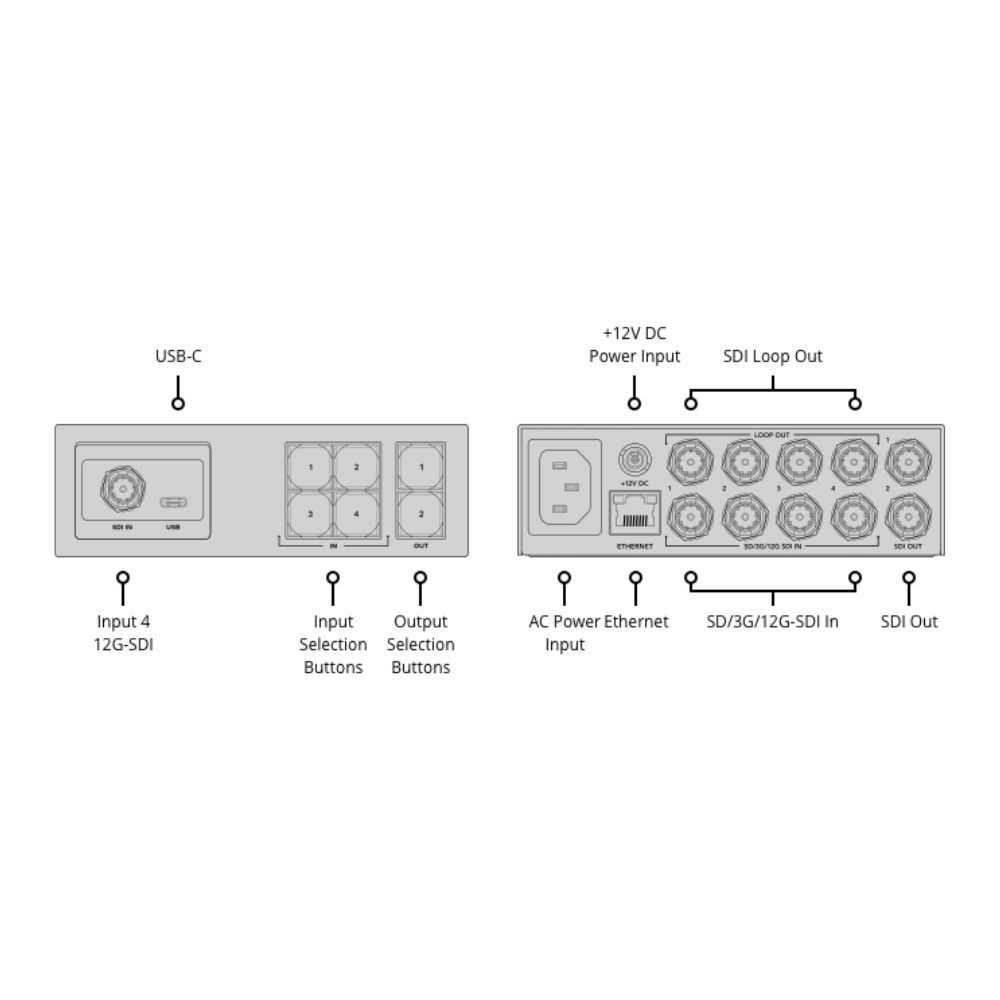 K zariadeniu Blackmagic Videohub Mini 4x2 12G možno pripojiť akékoľvek zariadenie s výstupmi SD, HD-SDI, 3G-SDI, 6G-SDI a 12G-SDI. 12G-SDI poskytuje vysokú snímkovú frekvenciu v rozlíšení Ultra HD prostredníctvom jediného kábla BNC, ktorý je zároveň plne kompatibilný s bežnými zariadeniami HD. Vďaka tomu môžete plynule prepínať medzi rôznymi video vstupmi a výstupný štandard SDI sa automaticky prispôsobí. Videohub podporuje všetky video štandardy vrátane 525 NTSC, 625 PAL, 720p, 1080i, 1080p, 2K, 4K a všetky formáty Ultra HD.
