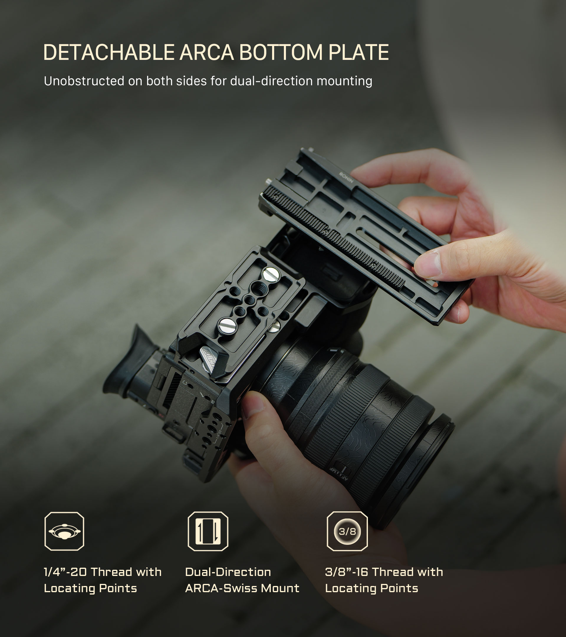 Predstavujeme kompletnú sadu Full Camera Cage Pro Kit pre Sony FX2. Táto kamera podporuje rôzne príslušenstvo prostredníctvom upevňovacích bodov, ako sú závity 1/4”-20 a 3/8″-16 s rôznymi upevňovacími bodmi, prijímačom studenej pätice, lištou NATO a upevňovacími bodmi pre držiak jednej tyče. Nová obojsmerná spodná doska ARCA je ideálna na rýchly prechod medzi statívom a gimbalmi DJI. Táto doska je teraz odnímateľná, čo umožňuje používateľom rýchlo ju odstrániť a namontovať na bok puzdra, aby sa ľahko prešlo na vertikálnu konfiguráciu. Upozorňujeme, že toto puzdro používa štandard DJI pre ARCA. Kompatibilita s inými štandardmi nie je zaručená.