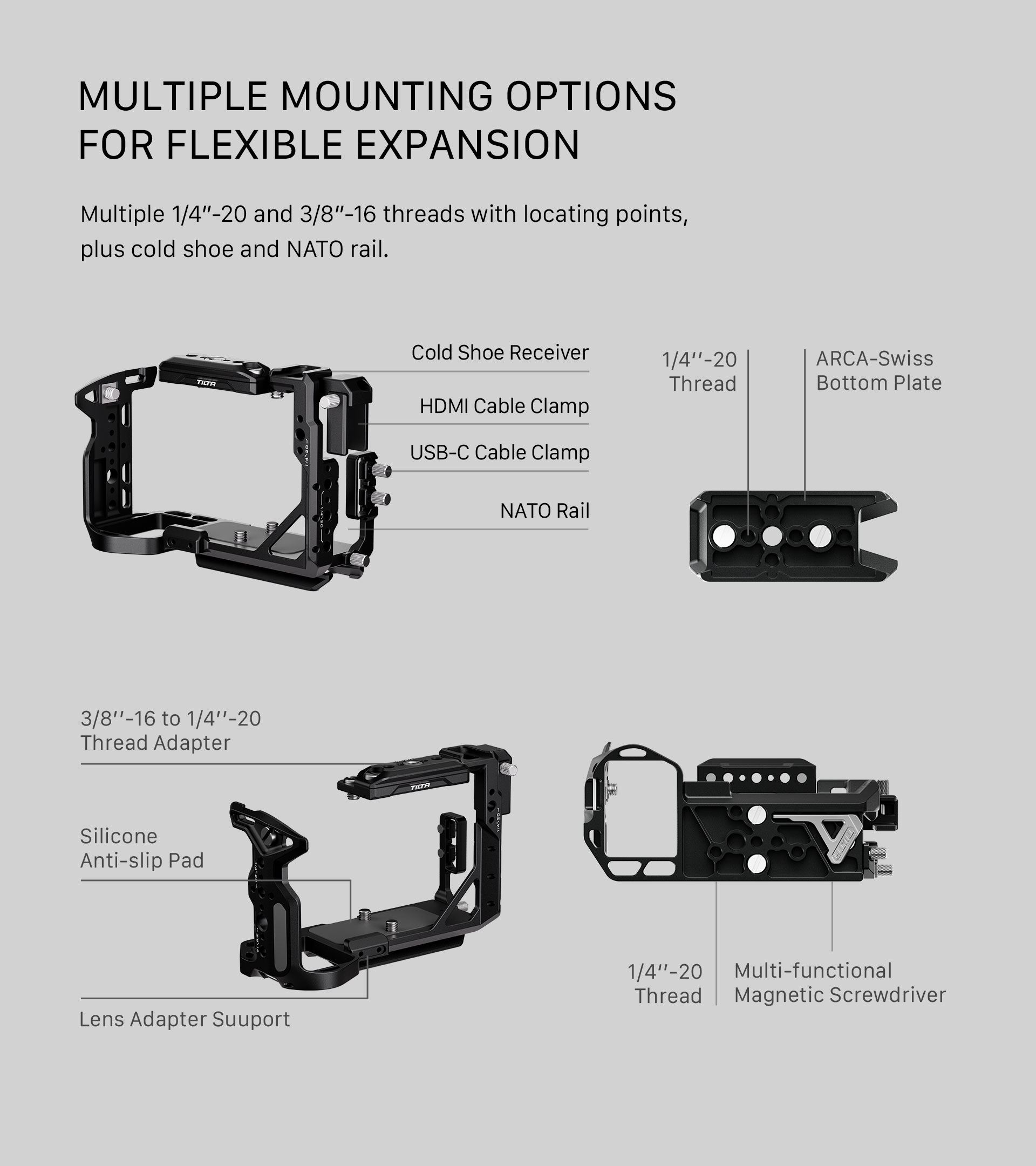 Tento kamerový rám podporuje rôzne príslušenstvo prostredníctvom montážnych bodov, ako sú závity 1/4”-20 a 3/8″-16 s rôznymi polohovacími bodmi, prijímačom studenej pätice, lištou NATO a montážnymi bodmi pre držiak jednej tyče.