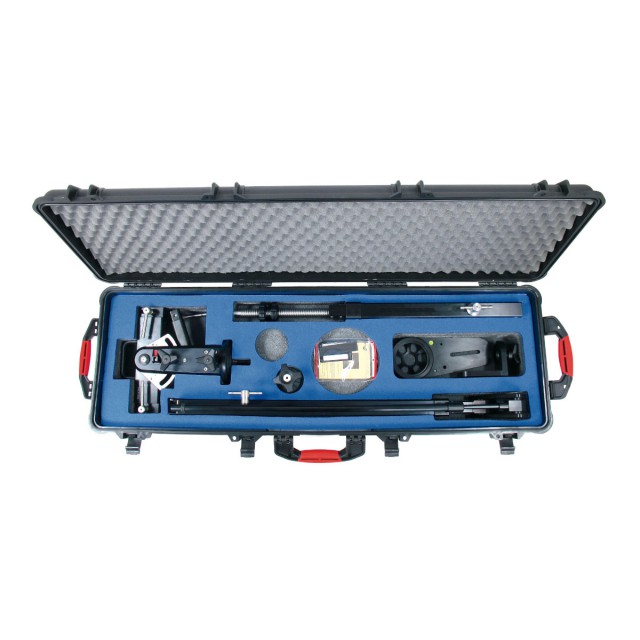 Konfigurácia súpravy JIBO zahŕňa robustný vodotesný ľahký živicový kufor s kolieskami, 100 mm nástavec základne miskovej hlavy s viacnásobnou orientáciou, zľava doprava a na/pod a 2 vodováhy.