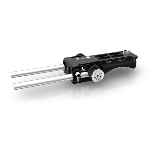 Ľahká podpora Chrosziel pre kameru SonyFS5/FS5 II s tyčami má na spodnej strane dosku s V-úchytom na pripevnenie k doskám VCT-14 a posuvnú ramennú podložku, ktorá sa vysúva, aby poskytla dostatok priestoru na bezpečné pripevnenie k doske VCT-14.
