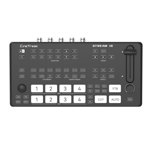 CineTreak Stream 1S je robustný profesionálny prepínač na živé vysielanie, ktorý je skonštruovaný tak, aby spĺňal požiadavky živej produkcie s viacerými kamerami. Vďaka 4 vstupom SDI, 1 výstupu PGM, 1 výstupu PVW/AUX a 6 vstupným kanálom vrátane SDI, AUX, médií na pozadí a downstreamových zdrojov umožňuje dynamické, viacvrstvové živé prepínanie.