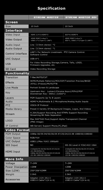 CineTreak Stream Master SDI je profesionálny 10" video mixér s podporou až 4 vstupov HDMI alebo SDI, pokročilým ovládaním PTZ, duálnym streamovaním RTMP a hliníkovým telom s otočnou obrazovkou - ideálny pre špičkové hybridné živé produkcie.