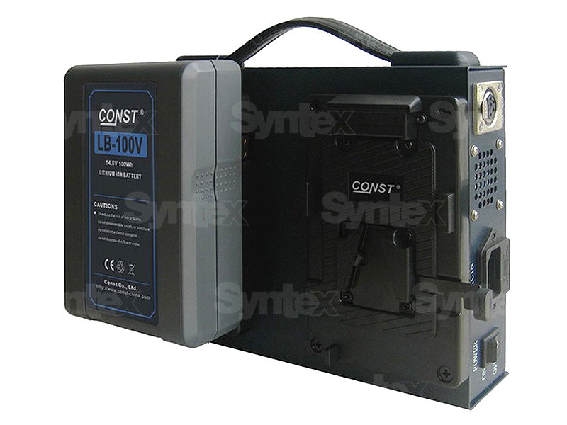 Stolná dvojkanálová nabíjačka Const pre batérie s V-mount môže nabíjať dve batérie súčasne alebo poskytovať jednosmerný prúd ako adaptér.