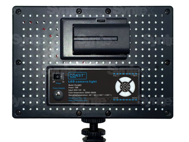 CONST Pro 308T je regulovateľné univerzálne bi-color LED svetlo (obsahuje až 308 LED diód) určené pre väčšinu kamier a DSLR fotoaparátov. Svetlo má plynule nastaviteľnú farebnú teplotu (od 5600K do 3200K) a možnosť napájania zo SONY kompatibilných batérií NP-Fxxx.