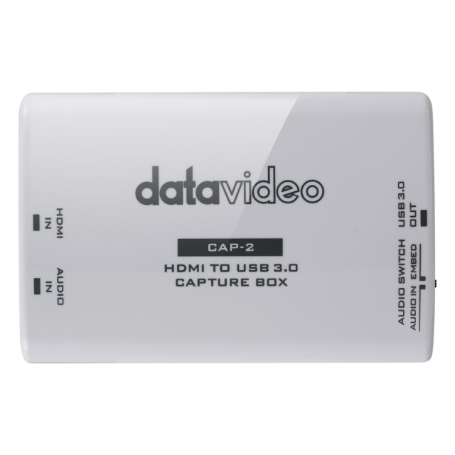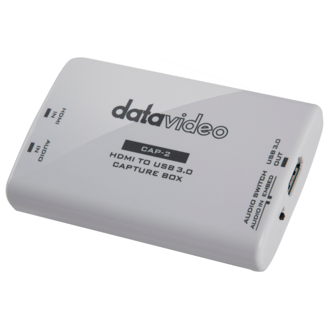 Datavideo CAP-2 je zariadenie HDMI > USB 3.0 UVC na nahrávanie alebo streamovanie videa až do rozlíšenia 1080p50/60 zo zariadení HDMI do počítačov s operačnými systémami Windows, Linux a macOS s niektorou z podporovaných aplikácií/služieb (OBS, VLC, Skype atď.). Ponúka podporu vstavaného a externého zvuku a úplnú inštaláciu typu plug-and-play.