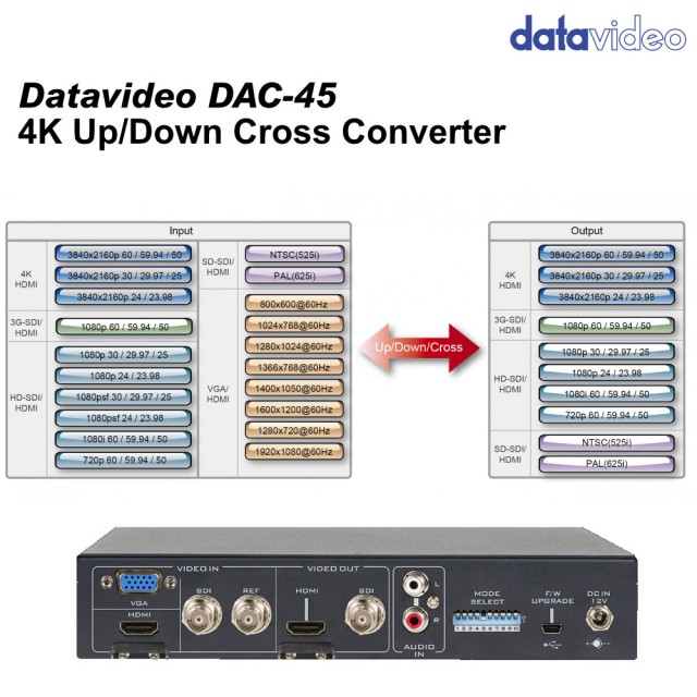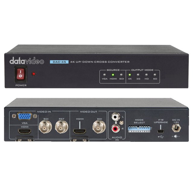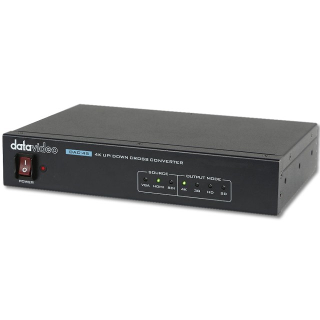 Datavideo DAC-45 4K Up/Down/Cross Converter umožňuje používateľom prepínať medzi rôznymi formátmi videa a konvertovať rozlíšenia nahor/dole, čím sa dosiahne plynulá konverzia videí VGA, HDMI a SDI na signál 4K HDMI alebo 1080p HDMI/SDI. DAC-45 obsahuje všetky funkcie, ktoré budete potrebovať, a je prenosný a ľahko sa používa.