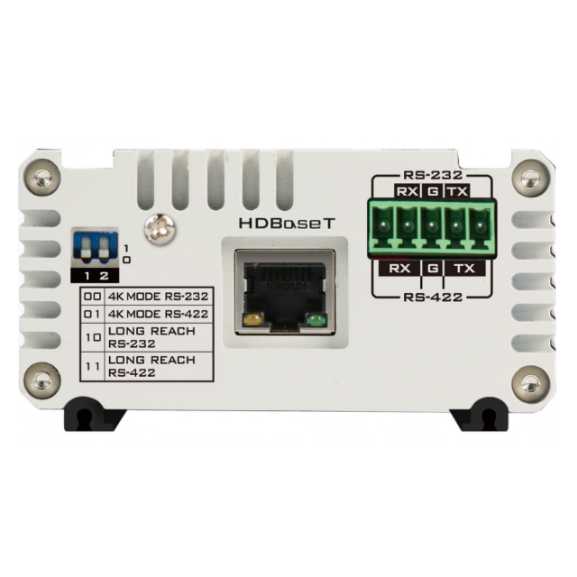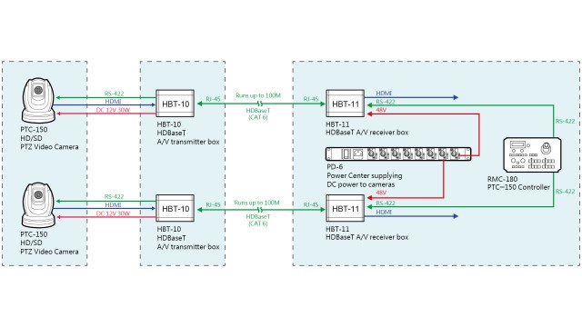Prijímač pre kamery PTZ (PTC-140T/150T) s rozhraním HDBaseT. Umožňuje prenos videa, zvuku, príkazov DVIP (RJ-45), príkazov RS-422/232 (rozhranie Phoenix) a napájania PoE cez jeden kábel Cat.5e/6/6a/7 na vzdialenosť až 100 m v režime FHD. Výstup HDMI s podporou formátov 3840x2160p30/29,97/25/24/23,98, 1080p60/59,94/50/30/29,97/25/24/23,98, 1080i60/59,94/50, 720p60/59,94/50. Obsahuje 48V= napájací zdroj a redukciu Phoenix > RJ-45.
