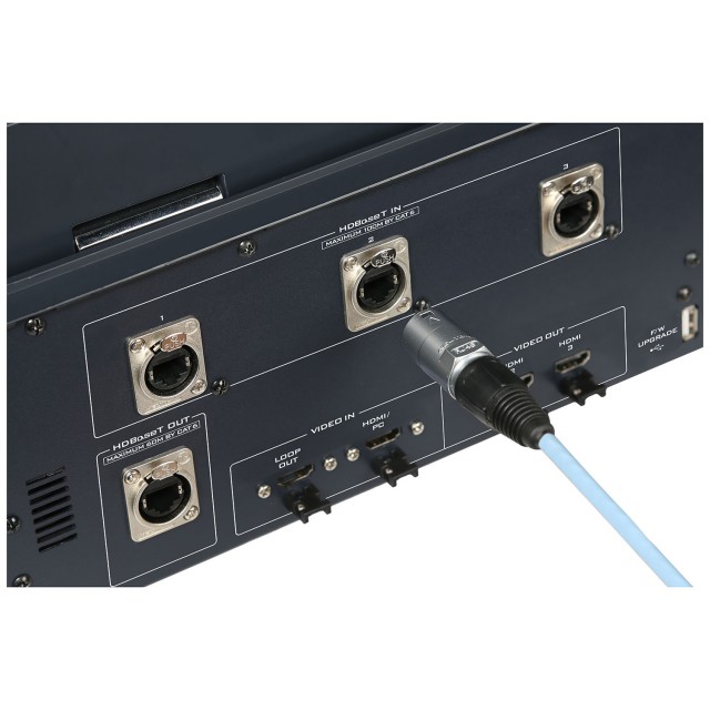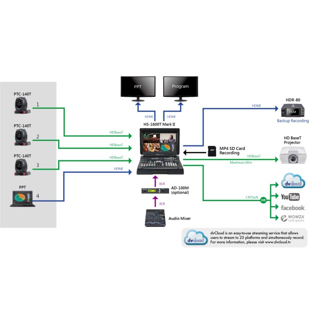 Zabudovaná technológia HDBaseT umožňuje prijímať signály 1080p z troch PTC-150TL alebo PTC-140T HDBaseT PTZ kamier prostredníctvom kábla CAT6. Je vybavená technológiou PoE na zabezpečenie napájania troch kamier PTC-150TL alebo PTC-140T, vďaka čomu je inštalácia rýchla a jednoduchá. Pri zachovaní užívateľskej prívetivosti stačí stlačiť jedno tlačidlo na súčasné streamovanie do preferovanej siete CDN a nahrávanie na kartu SD.