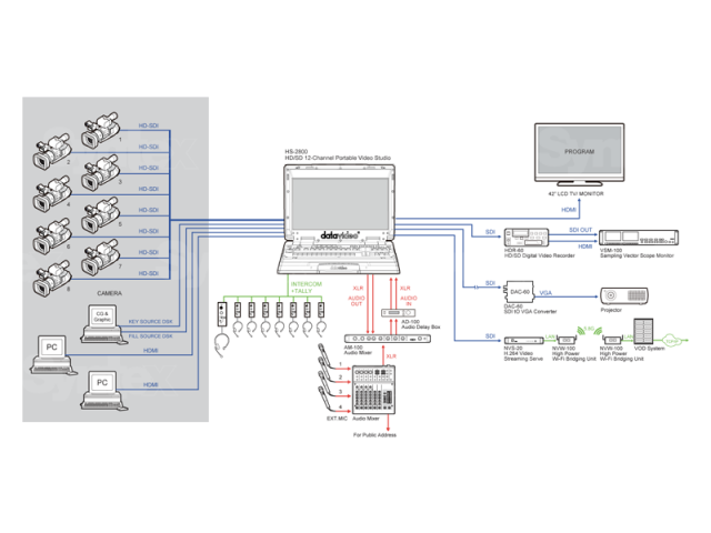 Datavideo HS-2850-8 je prenosná SD/HD 8 kanálová video réžia so 17,3" LCD displejom, disponujúca efektami, zabudovaným intercomom a tally systémom.