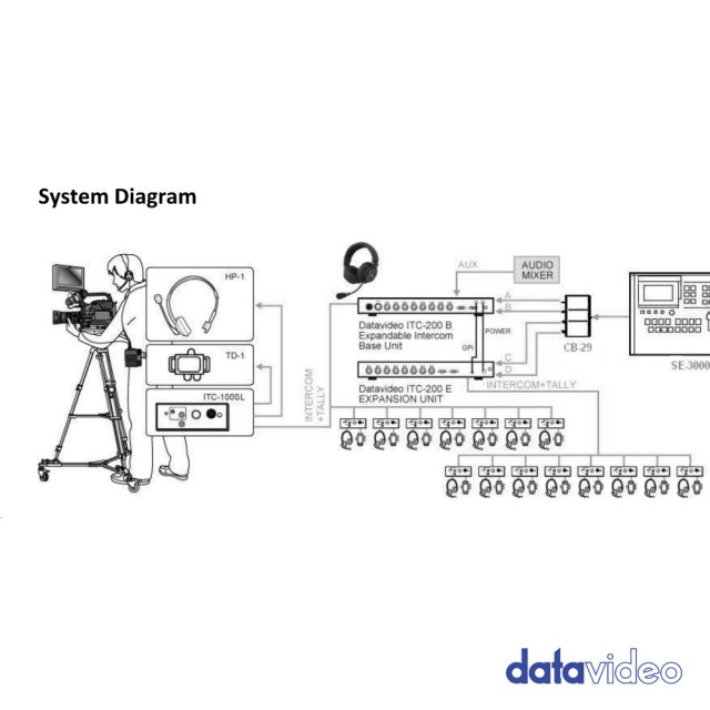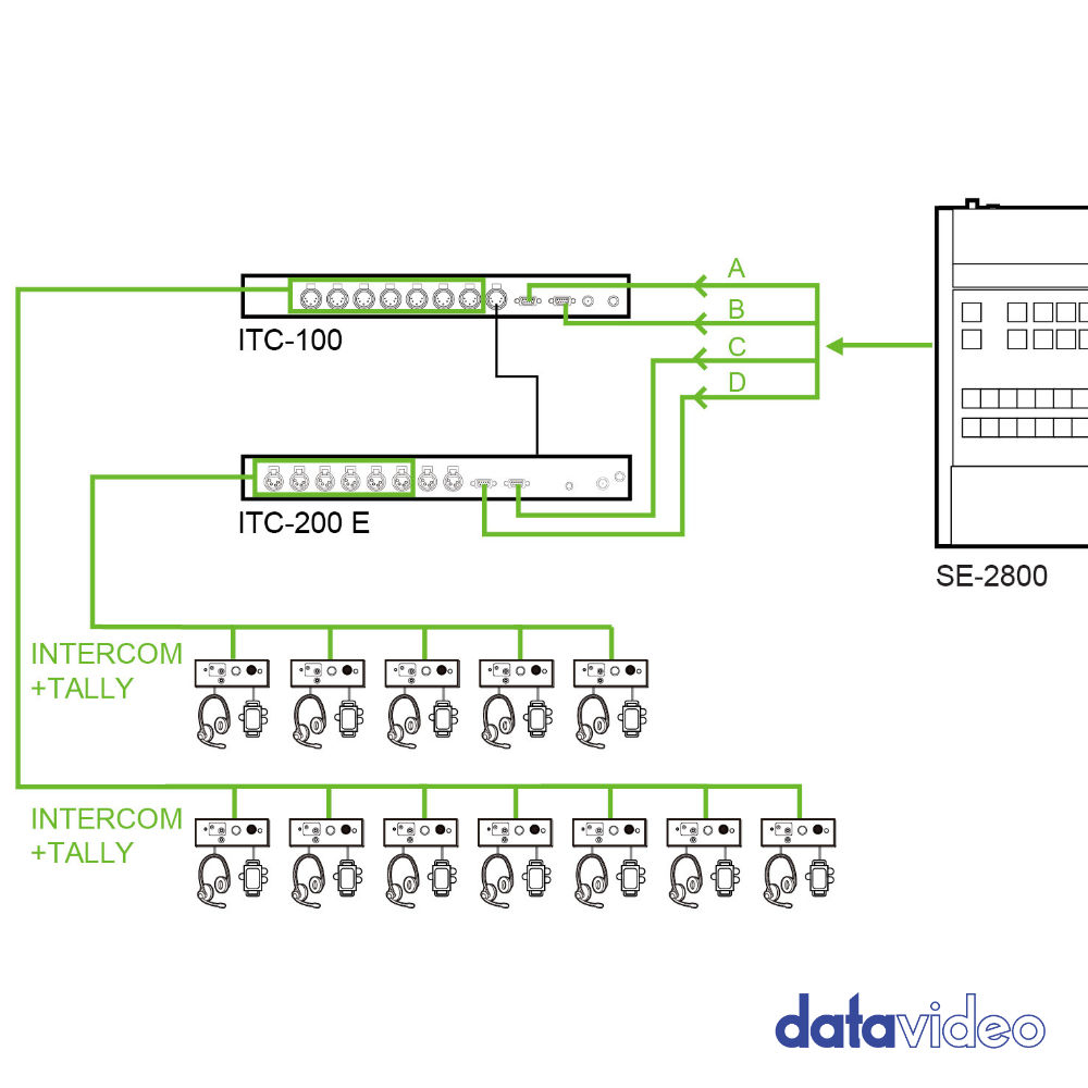 ITC-200E poskytuje ďalších 8 kanálov k systému Datavideo ITC-100 tally/talkback. Táto kombinácia ITC-100/ITC-200E účinne poskytuje 15-kanálový systém. Kombinácia ITC-100/ITC-200E umožňuje operátorovi hovoriť s kanálmi 1-7 samostatne a s ďalšími 8 kanálmi ako so skupinou alebo so všetkými 15 kanálmi naraz.