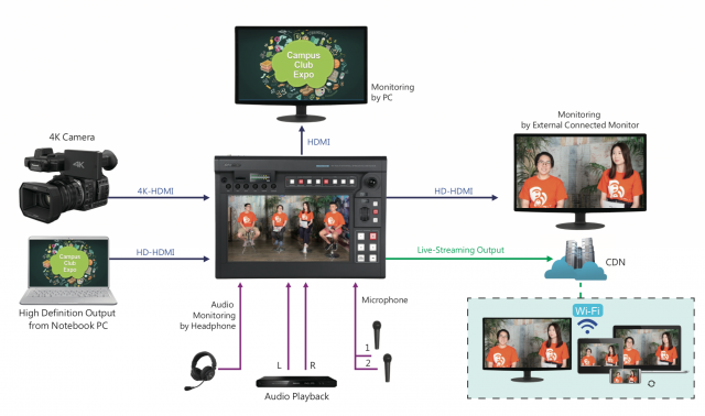 Datavideo KMU-200 je all-In-one (všetko v jednom) video réžia s funkciou streamingu, audio mixera a nájdete tu aj funkciu na ovládanie kamery. Ide o zariadenie do ktorého je možné pripojiť jednu 4K HDMI kameru a jeden ďalší HDMI video vstup (napr. notebook). Zo 4K video signálu je potom možné urobiť až 4 HD zábery (kamery). Nastavenie jednotlivých výrezov (záberov) sa dá nastaviť prostredníctvom LCD touch displeja alebo cez ďalšie ovládacie prvky ktoré KMU-200 ponúka.