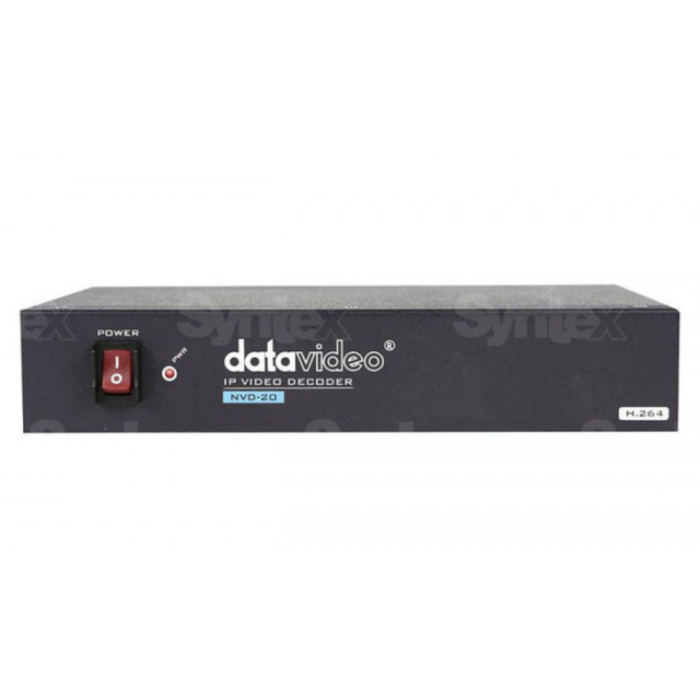 Dekodér NVD-20 môže spolu so serverom na streamovanie videa Datavideo NVS-20 vytvoriť Full HD video prepojenie z bodu do bodu prostredníctvom internetu, siete Ethernet alebo Wi-Fi. Dekodér NVD-20 dokáže dekódovať IP toky (vrátane RTP/RTSP, RTMP, UDP, TCP, HTTP a MPEG-TS) SD/HD videa streamovaného cez 10/100Mb Ethernet siete. Je vybavený zabudovaným škálovačom videa, vynikajúcou kvalitou obrazu a prevádzkou s nízkym oneskorením. Dekódované video je prítomné na zabudovaných výstupoch HDMI a kompozitnom výstupe, podporovaný je aj zvuk.