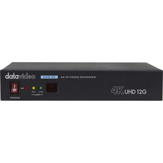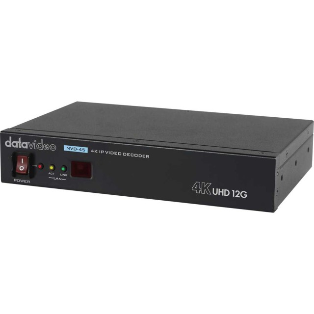 Datavideo NVD-45 je dekodér H.264/H.265 4K IP videa so súčasnými výstupmi SDI, kompozitného videa a analógového zvuku. NVD-45 dokáže dekódovať všetky bežné streamovacie protokoly, ako sú SRT, RTSP, RTMP, HLS a MPEG-TS, a výstupné video s rozlíšením až 4096 × 2160p. NVD-45 môže tiež priamo dekódovať video streamy z mnohých živých platforiem, ako sú YouTube Live, Dailymotion a Livestream. NVD-45 umožňuje vytvárať 4K point-to-point pripojenia cez Ethernet, Wi-Fi alebo verejný internet.