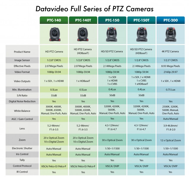 Model PTC-150 je vybavený motorizovaným 30-násobným optickým zoomom, širokým dynamickým rozsahom, kompenzáciou protisvetla, zrkadlením a otáčaním obrazu a svetelnou signalizáciou, keď je fotoaparát aktívny. Video výstupy zahŕňajú porty 3G-SDI, HDMI alebo CVBS, ktoré môžu súčasne vysielať video signály. Objektív má rozsah zorného poľa 2,3 až 63,7°, ako aj závit na filter M52 na pridanie samostatne dostupného filtra. Je tiež vybavený 50 programovateľnými predvoľbami polohy pre operácie otáčania, nakláňania a približovania.