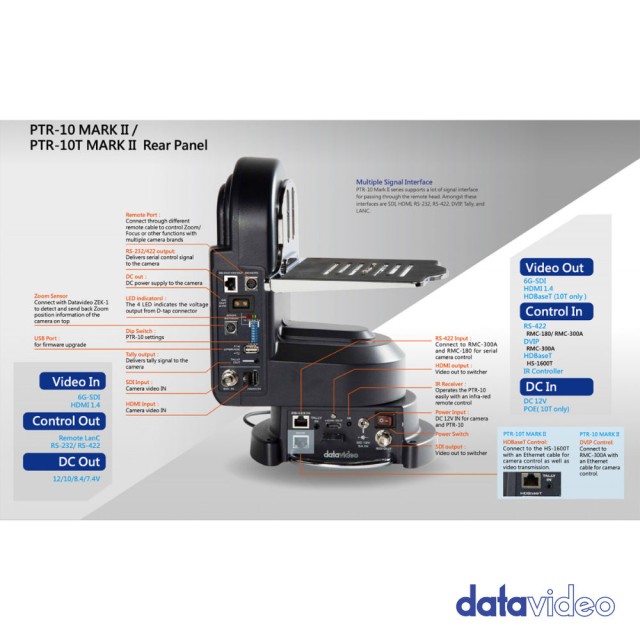 PTR-10 MARK II podporuje množstvo signálových rozhraní na prechod cez diaľkovú hlavu. Medzi tieto rozhrania patria SDI, HDMI, RS-232, RS-422, DVIP, Tally a LANC.