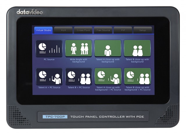 Ovládací panel so 7" dotykovou obrazovkou a podporou PoE. Je ideálnym riešením pre režijný systém Datavideo série 3200, prezentačný systém VGB-2000 v súčinnosti s kľúčovacím riešením DVK-400 (podporuje Lumakey, rozostrenie pozadia a výmenu pomocných vrstiev). Vďaka podpore PoE sa panel pripája jediným káblom (napájacím aj dátovým) a jednoduchú inštaláciu podčiarkuje aj veľmi kompaktný dizajn (220x152x79 mm, 0,85 kg). Tlačidlá sú samozrejme plne konfigurovateľné.
