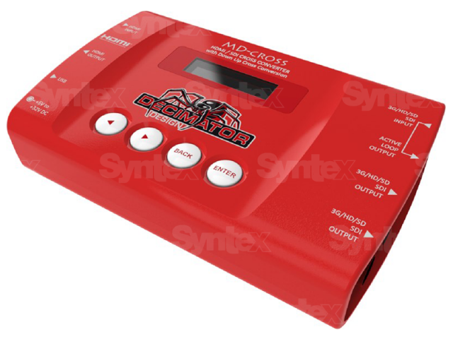 Decimator Design MD-CROSS je prenosný HDMI/SDI Cross Coverter so Scale a Frame Rate konverziou. Obsahuje LCD displej a tlačidlá ovládania. To umožňuje jednoduchý prístup ku všetkým vlastnostiam. Obsahuje identický Up/Down/Cross converter akoMD-DUCC