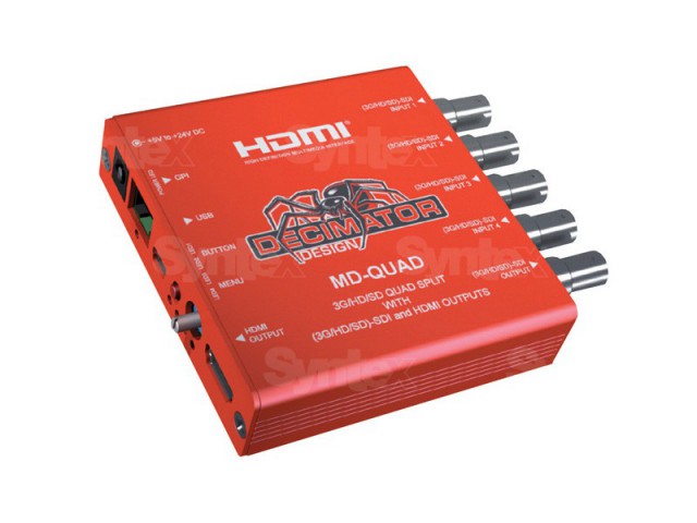 MD-QUAD v3 od spoločnosti Decimator Design je nízkonákladový miniatúrny štvornásobný rozdeľovač 3G/HD/SD-SDI 4 na 1 alebo multiplexor 4 na 1 vstup, ktorý má prepojené výstupy (3G/HD/SD)-SDI a HDMI.