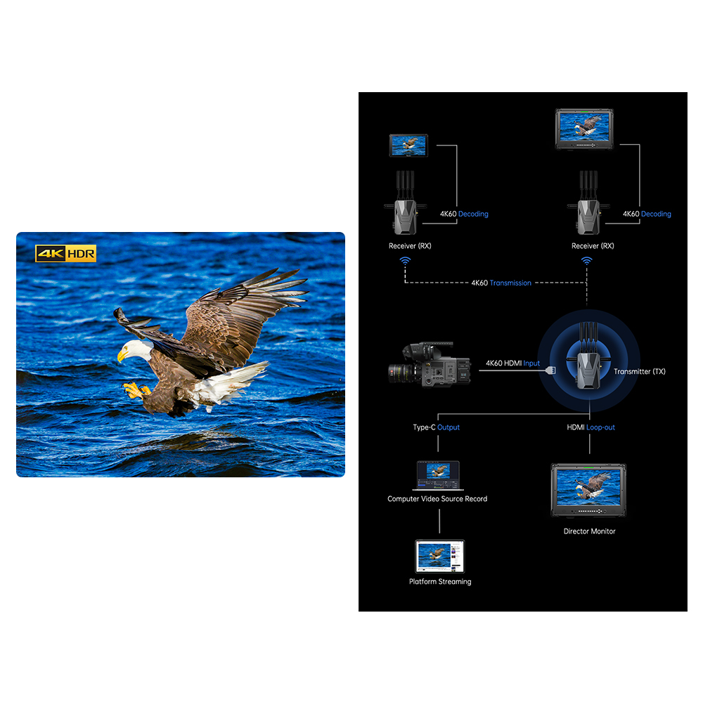 Spolupráca viacerých osôb, Atlas X podporuje spoluprácu na viacerých obrazovkách v pomere jeden k štyrom. Môže sa pripojiť a spravovať štyri zobrazovacie terminály súčasne, pričom poskytuje bezstratové 4K Ultra-HD obrazy s monitorovaním v reálnom čase. To pokrýva natáčanie viacerými kamerami a koordináciu na pľaci naraz, čo výrazne zvyšuje spoluprácu tímu a efektivitu práce. |