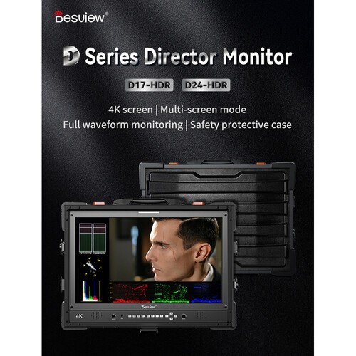 Desview D17-HDR je profesionálny 17,3-palcový 4K HDR vysielací monitor s HDMI a 3G-SDI vstupom/výstupom, režimami zobrazenia viacerých obrazov, nástrojmi na analýzu vlnových foriem a odolným ochranným puzdrom, určený pre produkciu v teréne, vysielanie a monitorovanie v kinách.