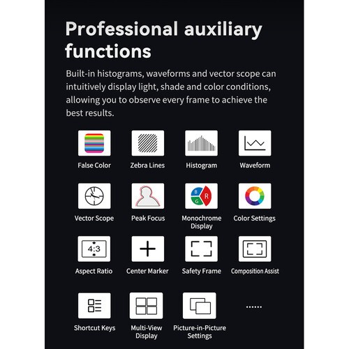 Monitor D17-HDR je navrhnutý pre univerzálne produkčné pracovné postupy, podporuje vstupy HDMI 2.0, 3G-SDI a USB s rozlíšením až 4K60 a poskytuje výstupy HDMI a SDI pre priechodné alebo externé rozdelenie. Pokročilé režimy multiview umožňujú monitorovanie na dvoch, troch a štyroch obrazovkách spolu s funkciou obraz v obraze. Profesionálne nástroje, ako sú vlnová forma, histogram, falošné farby, zaostrenie a zebra, pomáhajú s expozíciou a presnosťou zaostrenia. Monitor podporuje horizontálny aj vertikálny režim zobrazenia, vďaka čomu je vhodný pre tradičné formáty vysielania a sociálnych médií. Desview D17-HDR je umiestnený v odolnom hliníkovom ochrannom puzdre a ponúka flexibilné možnosti napájania, vrátane batérie V-mount, AC a 4-pinového XLR, a je spoľahlivým riešením pre monitorovanie na pľaci a v štúdiu.