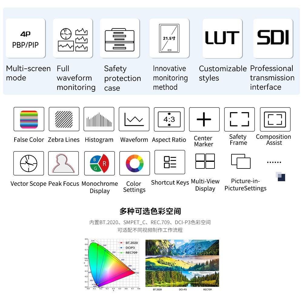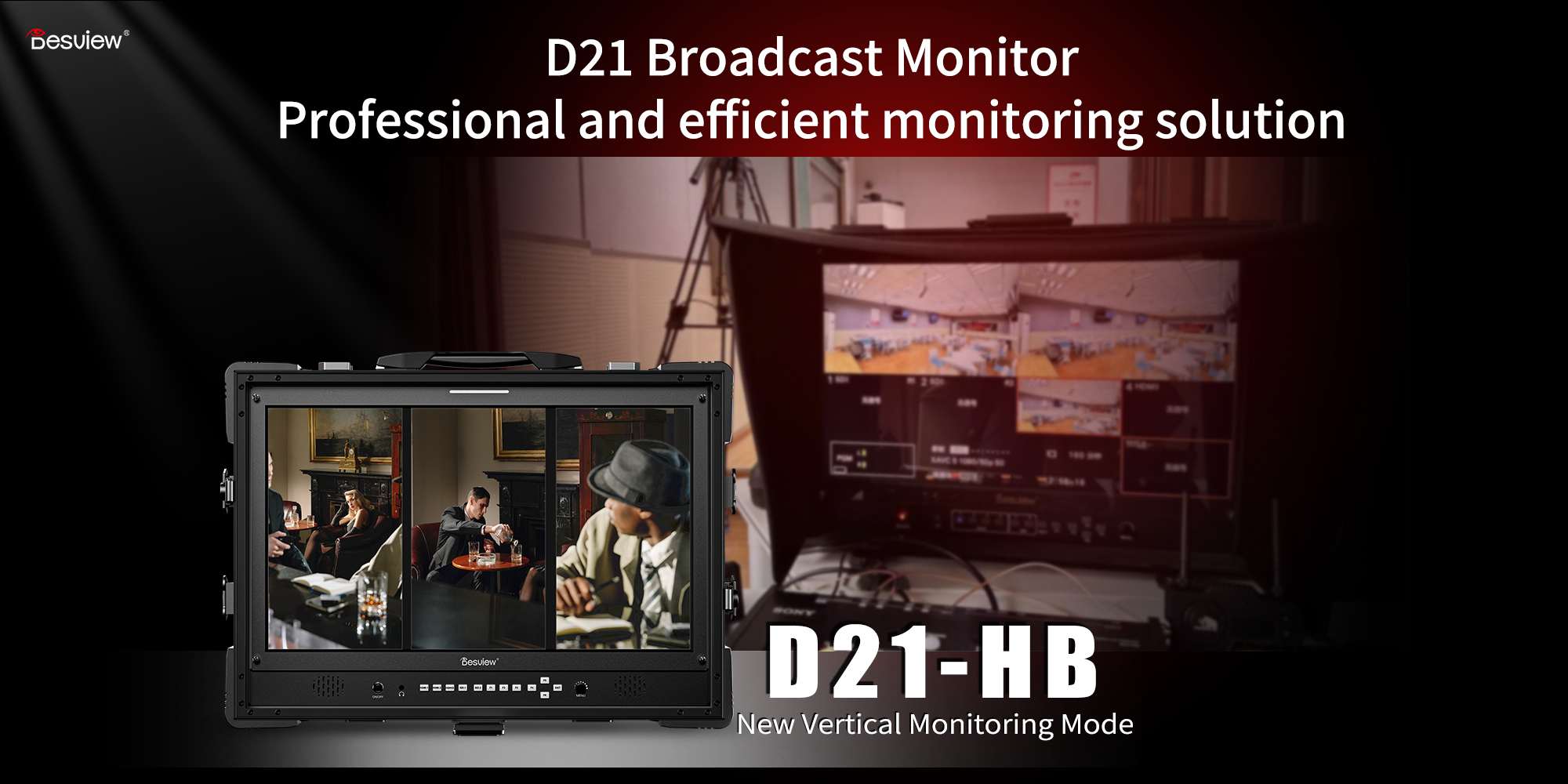 D21 Broadcast monitor. D21 možno použiť s rohovými podperami na dosiahnutie vertikálneho monitorovania obrazovky. Ponuku Ul možno tiež prepínať horizontálne a vertikálne, aby sa splnili potreby snímania rôznych scén. Obrazovku možno nastaviť na jednu obrazovku, dve obrazovkytri obrazovky alebo štyri obrazovky. podporuje režim obraz v obraze, aby vyhovoval rôznym potrebám monitorovania.