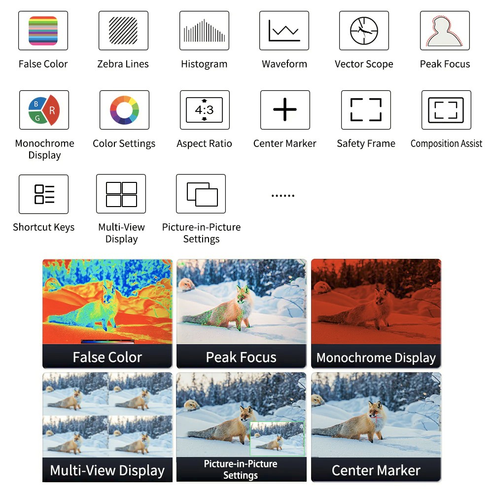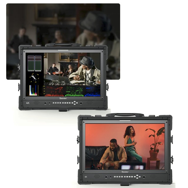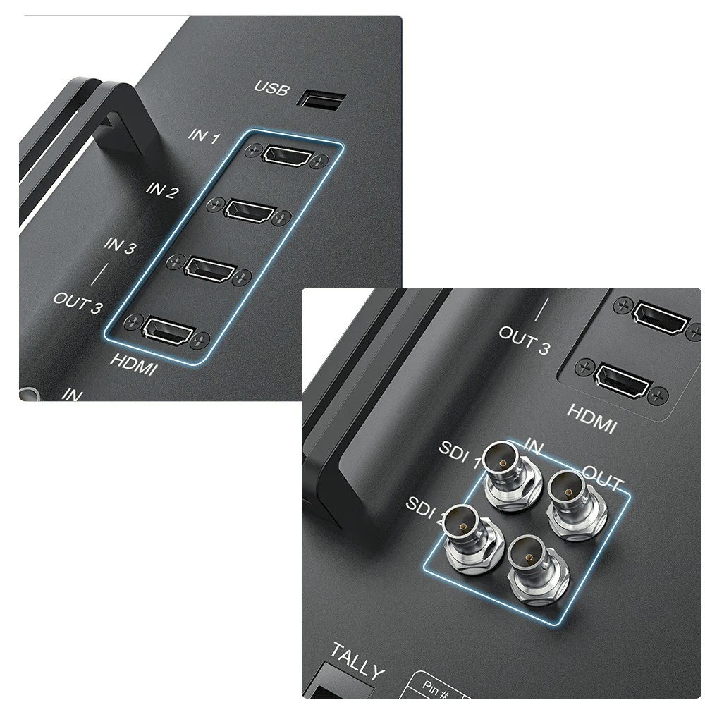 Monitor D24-HDR je navrhnutý pre pokročilé produkčné nastavenia a podporuje monitorovanie na viacerých obrazovkách s horizontálnou a vertikálnou orientáciou displeja, vďaka čomu sa dá prispôsobiť rôznym scenárom natáčania. Ponúka tri vstupy HDMI 2.0 a jeden výstup HDMI s podporou 4K@60Hz, spolu s profesionálnym vstupom a výstupom SDI pre prenos signálu v kvalite vysielania. Vstavané nástroje na monitorovanie plnej vlny, histogramu a vektorského skopu umožňujú presné ovládanie expozície, farieb a kvality obrazu. Vybavený predným systémom kontrolných svetiel a viacerými možnosťami napájania – vrátane batérie V-mount, napájania striedavým prúdom a vstupu XLR – je Desview D24-HDR robustným riešením pre režisérov, inžinierov a produkčné tímy.